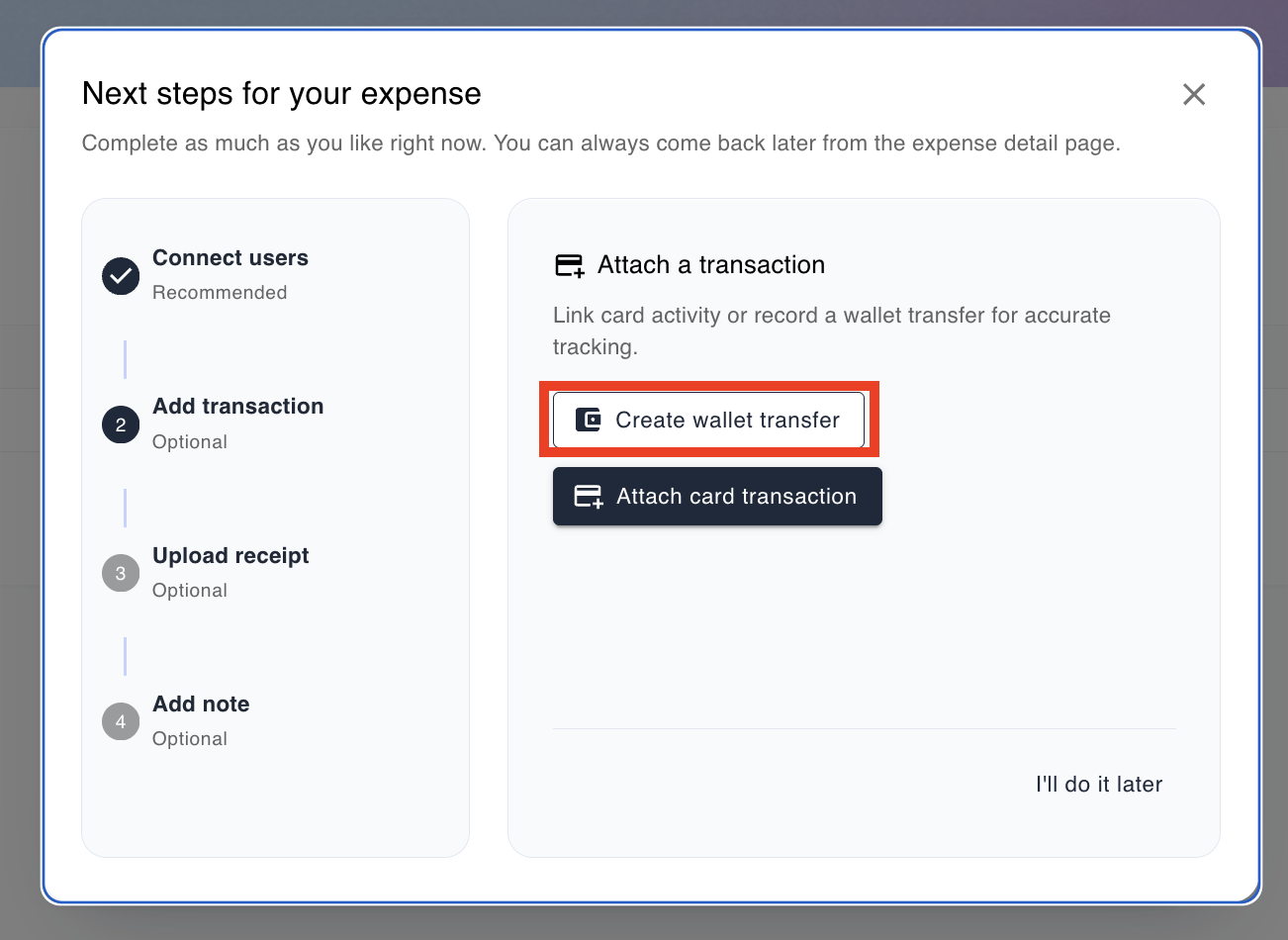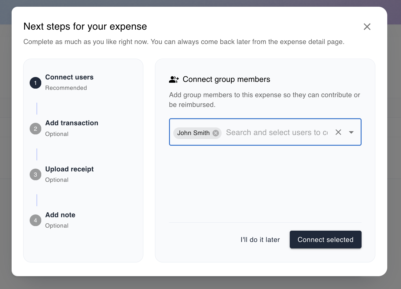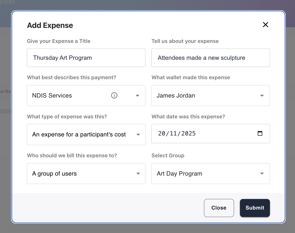 - 'Who should we bill this expense to': Select a group of users (even if it is only 1 participant)