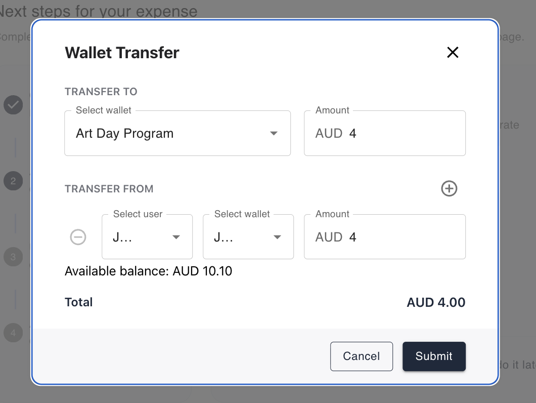 Select 'Create Wallet Transfer'. This will automate the transfer from the participant service wallet to your group wallet.